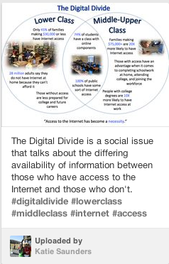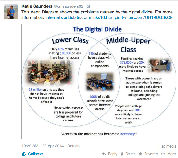 The week we talked about the digital divide, something hit close to home. I attended Hoover High School (along with my younger brother and sister) and my mom works there. A few years ago they bought iPads for every student that connects to WiFi. The idea behind this was that they can now have their textbooks on the tablet and complete their work on there as well. Because of the accessibility, teachers have begun making homework due at night as well. This becomes a problem for students who don’t have access to WiFi at home. So for my Bizzarro Research “Paper” I created a Venn Diagram that illustrates many issues concerning the digital divide. While technology is a good thing, it also puts those without access to it at a MAJOR disadvantage when it comes to education, careers, and even day-to-day activities. So on to the next challenge…how do I spread the message and increase awareness of the digital divide? My first thought of course was to post it on all of the social media platforms, which I did. But then I thought, how am I going to reach the people who are affected by the digital divide and won’t see my social media pages? They need to be reached too. To solve this problem, I took the message back to where it started for me: Hoover High School. I have printed my Venn Diagram and will be setting the flyers out in my mom’s classroom to raise awareness of the divide in the place where I first noticed it.